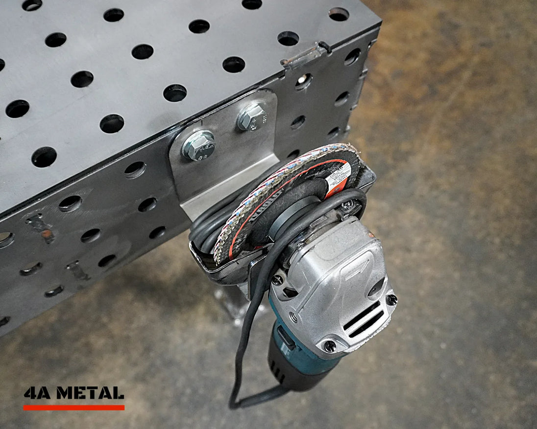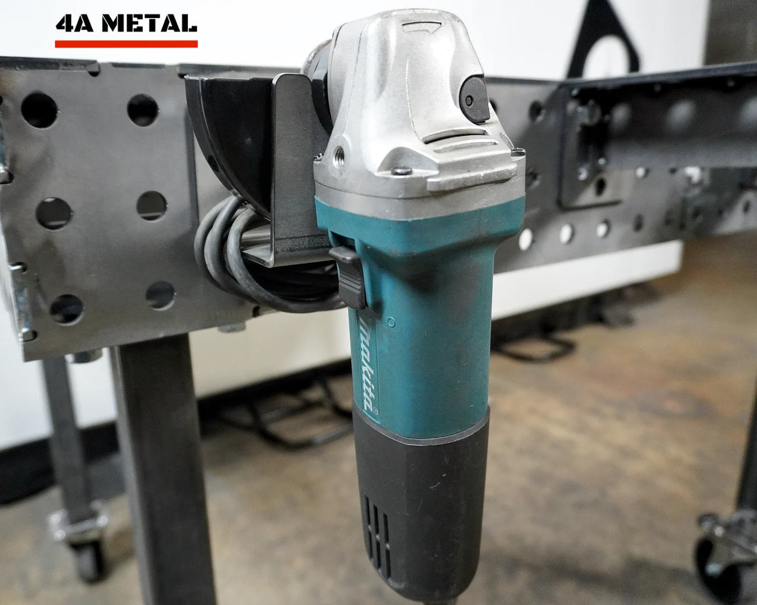 Le support de meuleuse (pour modèle 125mm) 4A Métal est un accessoire simple, robuste et ultra pratique pour garder votre meuleuse toujours à portée de main. Découpé au laser dans une tôle d’acier de 3 mm, il se plie facilement à l’étau et se fixe sur le rebord de la table de soudure en quelques secondes.