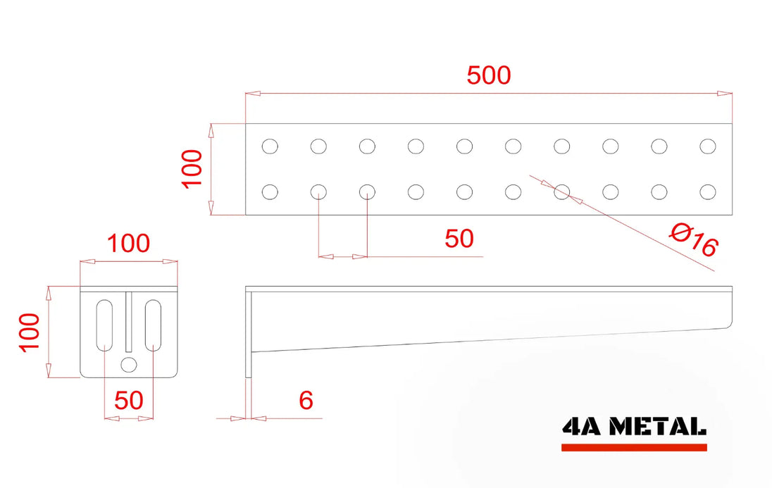 - Trous Ø16 mm espacés de 50 mm